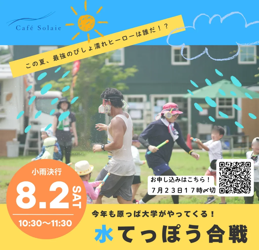 広〜いソライエひろばをかけまわって、みんなで水をかけ合おう。