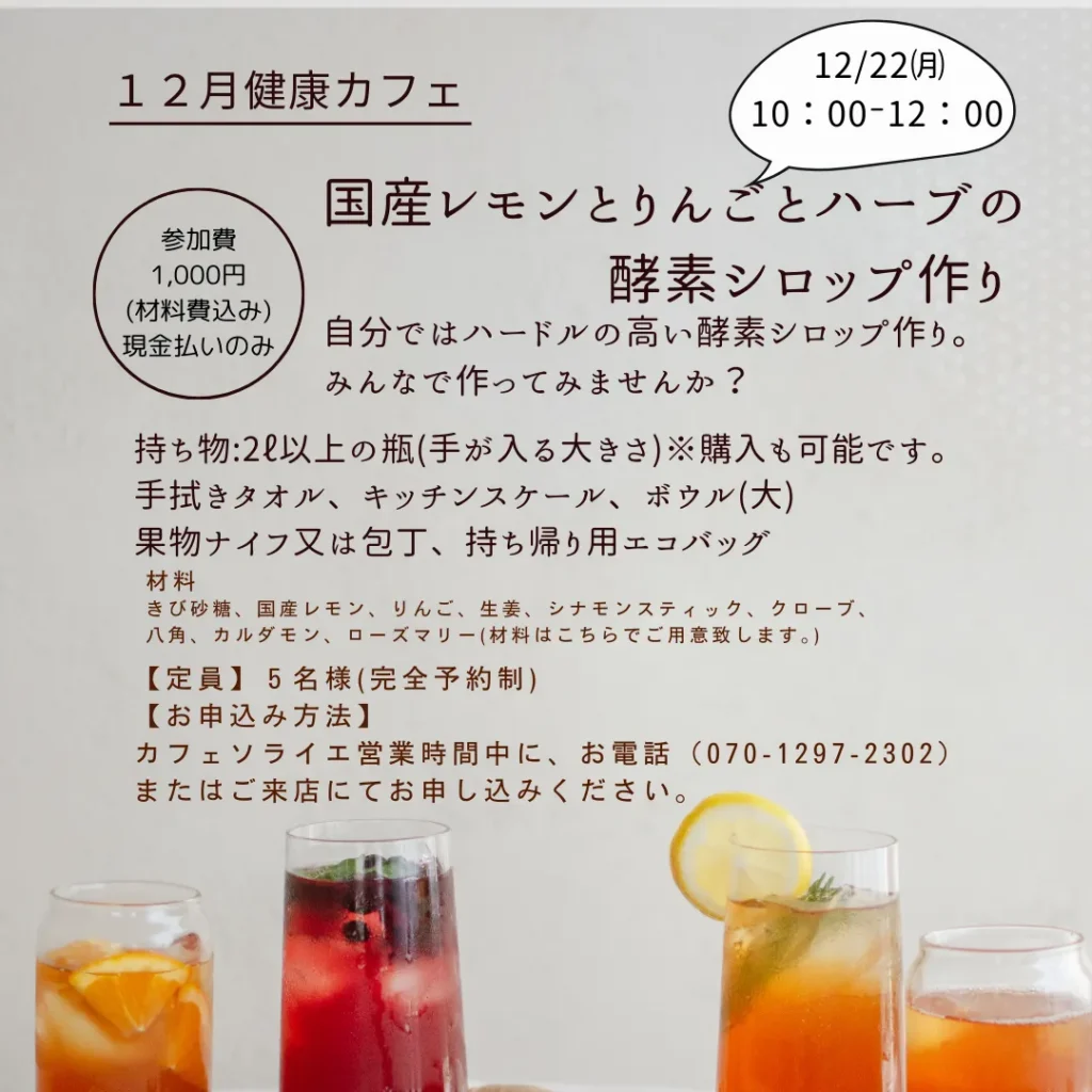 お申し込み方法:カフェソライエ営業時間中にお電話にて。(070-1297-2302)